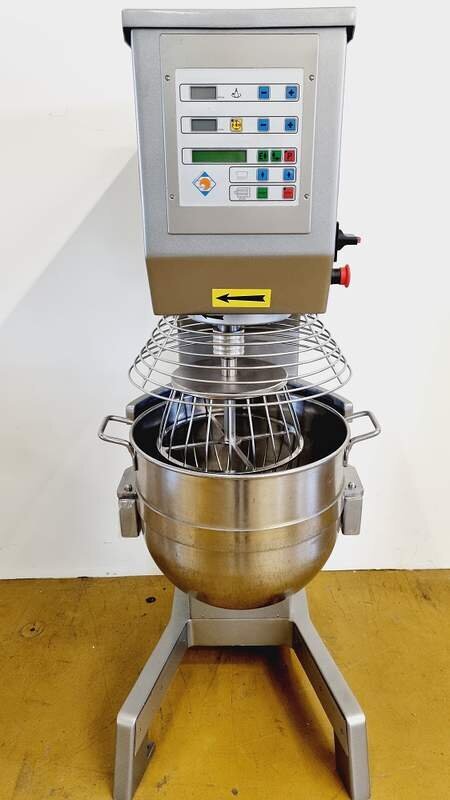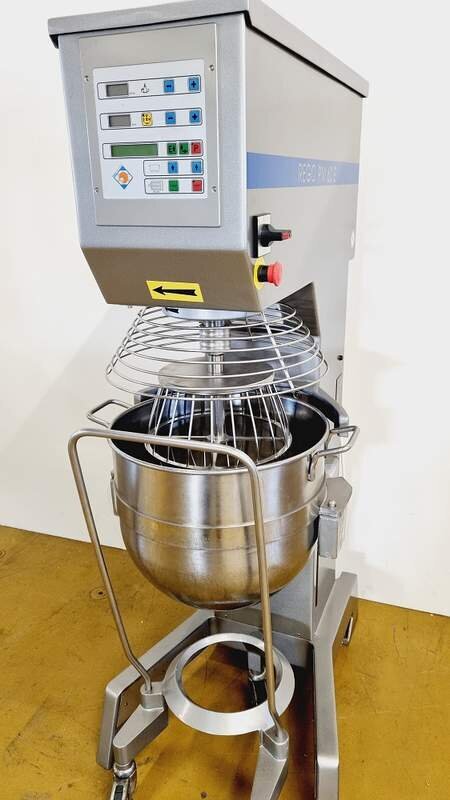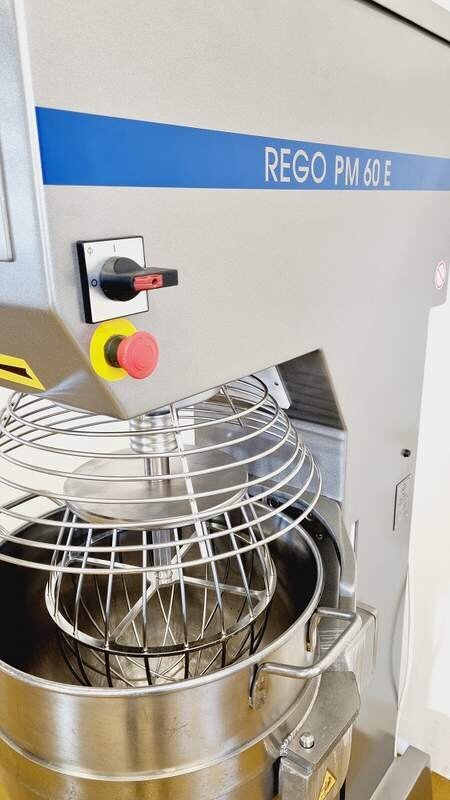 Die Planetenrührmaschine Modell: Rego PM 60 E ist mit Stufenloser Leistungsverstellung und LED Steuerung mit Zeitschaltuhr das Werkzeug 1 Edelstahlkessel 60 Liter, 1 Besen, 1 Flachrührer und Kesselwagen ist mit dabei.