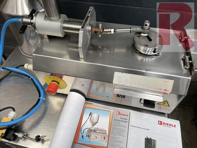 Riehle combi pastry filler line 2.000 with 2 stainless steel hoppers for approx. 15 litres each, 1 lid and a dosing hose (approx. 1.5 metres long) with dosing tip and manual operation. Tested and cleaned. Efficient and fast filling of all viscous masses and creams (e.g. fruit fillings, puddings, etc.) thanks to a mechanical piston pump, the filling quantity can be preselected mechanically, continuous and pulsed operation at the touch of a button. 230 V operation, approx. 0.5 kW motor power.