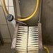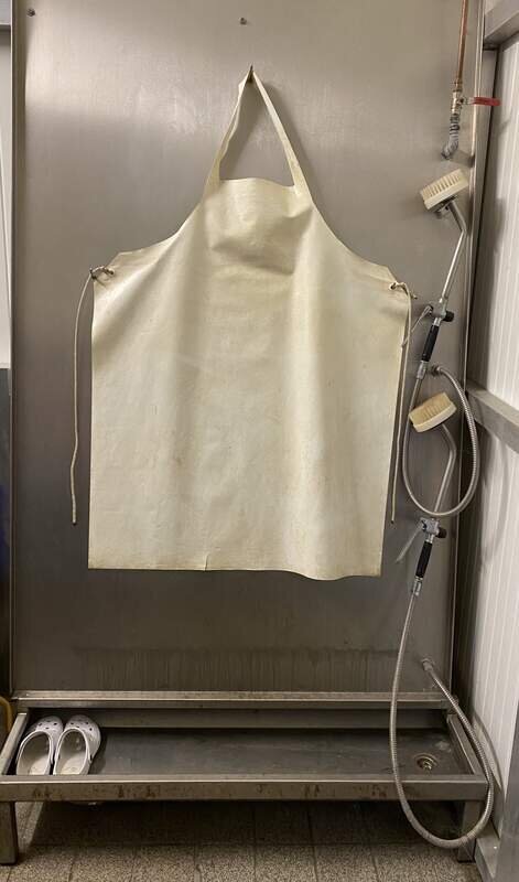 Die Schürzen werden an die Befestigungspunkte an der Wand aufgehängt. Mit der Waschbürste werden die Schürzen gereinigt. Die Stiefel werden mit dem Fuss auf dem Bodengitter platziert und ebenfalls mit der Hand gereinigt.