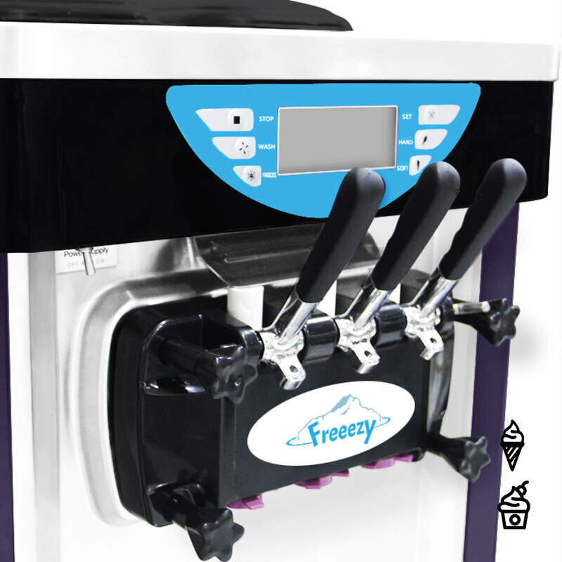 Fertige Mischung in die separat nebeneinanderliegenden, selbstkühlenden Eisbehälter füllen und “Freeze” Knopf drücken. Die Softeismaschine beginnt mit der Zubereitung der Mischung. Wie fortgeschritten die Produktion ist, lässt sich jederzeit am digitalen Display ablesen. Aus den 3 Zapfhähnen bekommen Sie also 2 Sorten Softeis und 1 Mix aus beiden Sorten. Einfache Bedienung, diversen Einstellungen und Modi sorgen für maximalen Komfort.