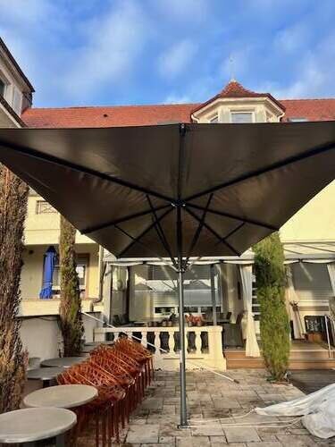 Besonder langlebiger Sonnenschirm von May für die Außengastronomie, 3 x 6 Meter, mit Kurbel bedienbar inkl, Schutzhülle und 3 Seitenteilen