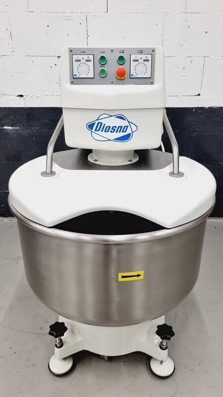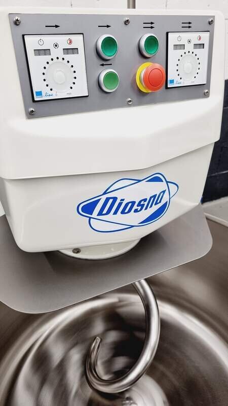Der Spiralkneter Diosna Modell: SP 120 D ist fahrbar mit 2 Zeitschaltuhren und 2 Gänge sowie einer Mehlstaubhaube, Kessel und Spirale ist in Edelstahl