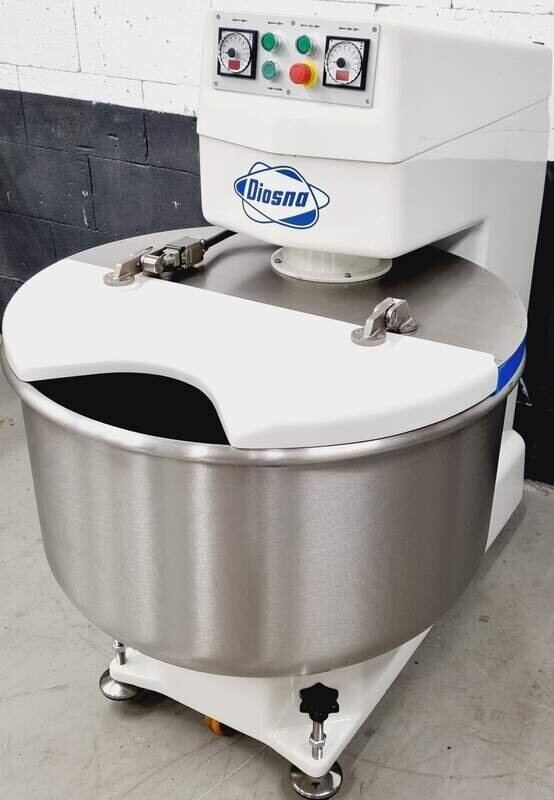 Der Spiralkneter von Diosna, Modell: SP 160 D ist mit 2 Gänge und 2 Uhren sowie mit Edelstahlkessel + Edelstahlspirale und einer Mehlstaubabdeckung, Gebrauchtmaschine überholt mit Gewährleistung