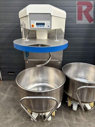 Diosna SPV 160 AF spiral mixer with remoeable stainless steel bowls (2 pieces) for up to approx. 160 kg of dough or 125 kg of flour, built in approx. 2010, used, in very good condition both technically and visually, tested and cleaned, with standard hydraulic clamp locking for the bowl trolley and plastic bowl wall scraper. The control system with plain text display and programme memory has already been renewed once, the machine is fully functional. Also perfectly suited for small and medium-sized bakeries.