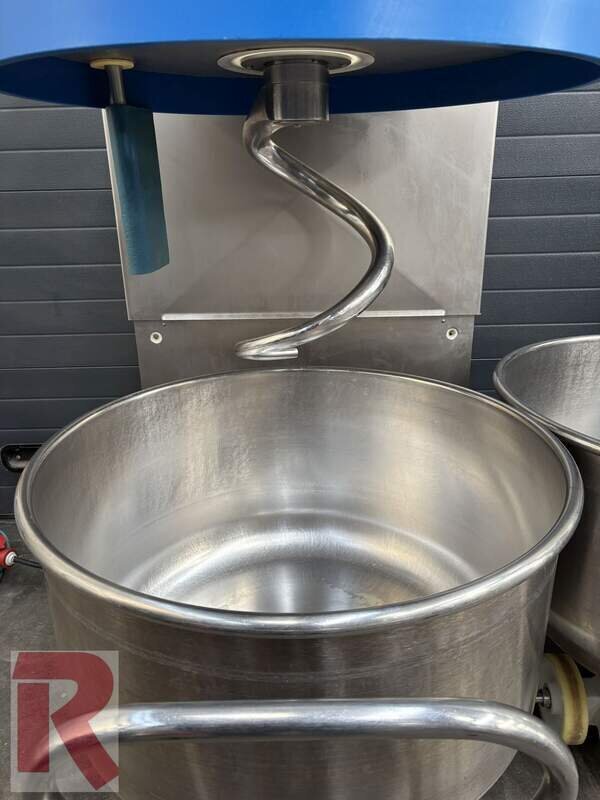 Diosna SPV 160 AF mit ausfahrbaren Edelstahl-Kesseln (2 Stück) für bis zu ca. 160 kg Teig bzw. 125 kg Mehl, gebraucht, in sehr gutem Zustand sowohl technisch als auch optisch, geprüft und gereinigt, mit serienmäßiger hydraulischer Zangenverriegelung