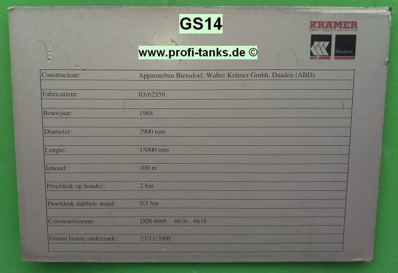 Stahltank 100.000 Liter, gebraucht, doppelwandig, Heizöltank, Löschwassertank, Löschwasserbehälter, Wasserzisterne, Lagerbehälter n. DIN6616/2. Guter Zustand, ca, 2,9m x 15,8m; 17t; Hersteller: Krämer Apparatebau. profi-tanks