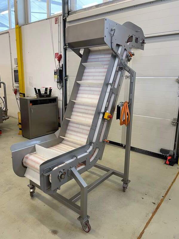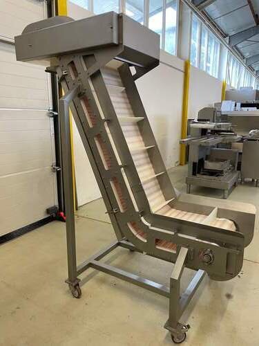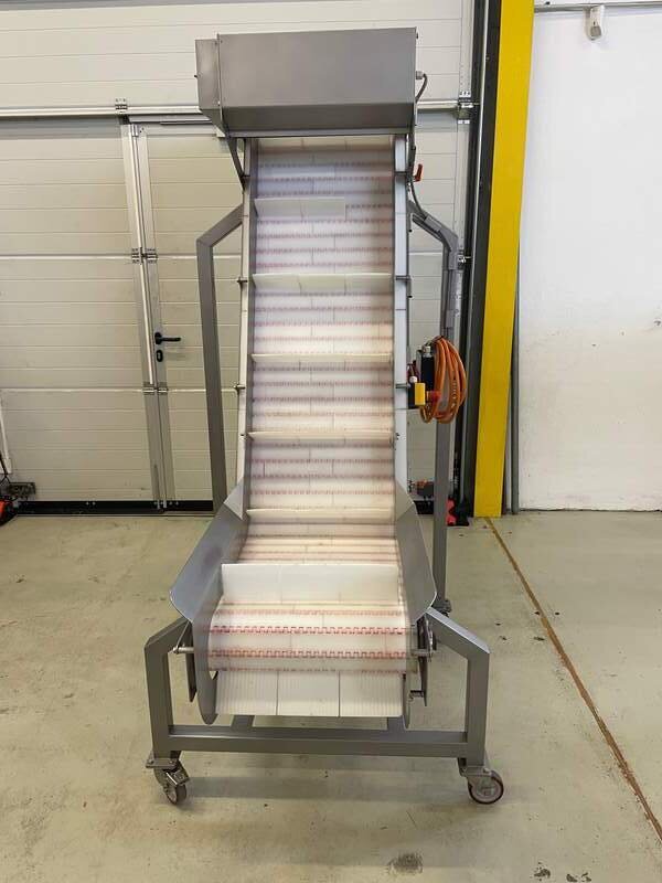 Wir verkaufen hier ein Transportband / Steigband / Giraffe in einem sehr guten gebrauchten und funktionstüchtigen Zustand. Das Band läuft auf 400 Volt, Baujahr 2013, komplett Edelstahl, Kunststoffband mit Mitnehmer, Bandbreite 45 cm, Steighöhe 210 cm, höhenverstellbar, mit Steigung / Steigband, rollbar, Werkstatt geprüft, weiteres auf Anfrage.
