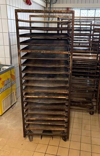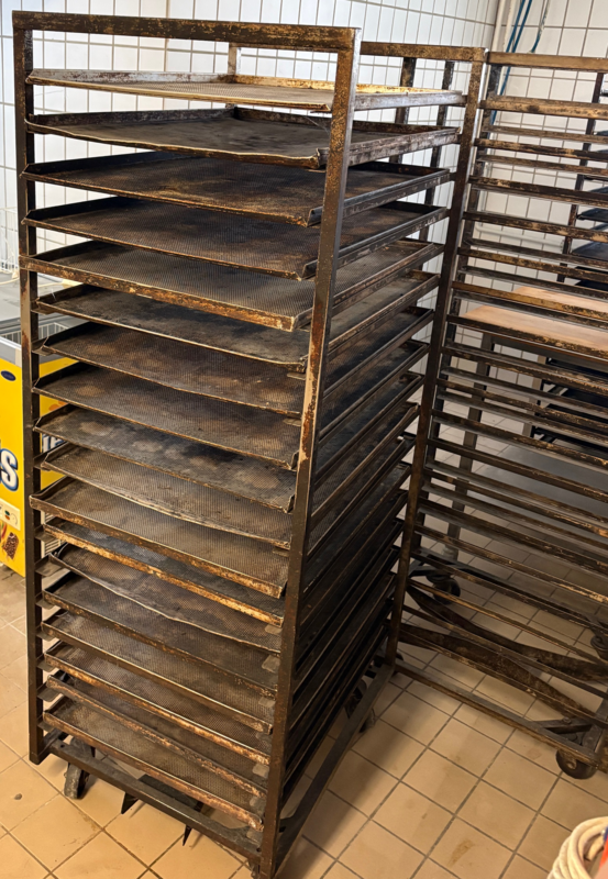 Gebrauchte Stikkenwagen/Backwagen für 60×80 Bleche, passend für WP-Öfen. Ohne Bleche. Rollen funktionsfähig (teils Geräusche). Mehrere Stück verfügbar, Mengenrabatt möglich