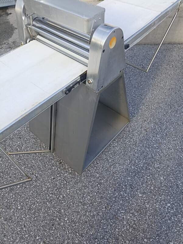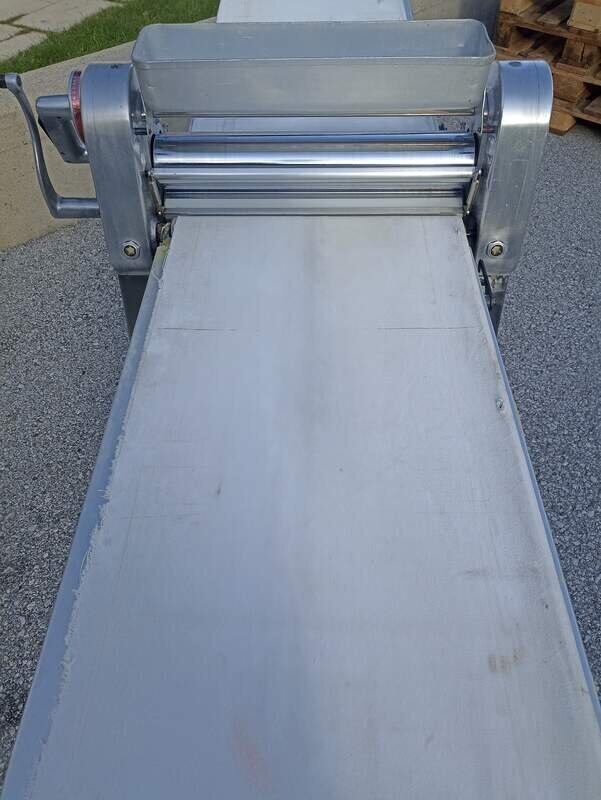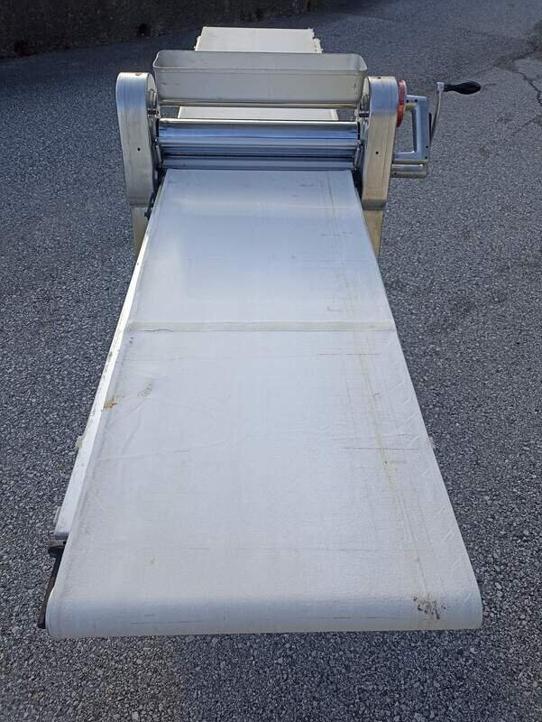 Teigausrollmaschine Rondo mechanisch mit Kurbel sehr guter gebrauchter Zustand Abstreifer neuwertig ein Band gut das zweite der Länge nach eingerissen Optional mit einem oder zwei neuen Bändern beide plus 300 Maschine kann auch als Tischmaschine