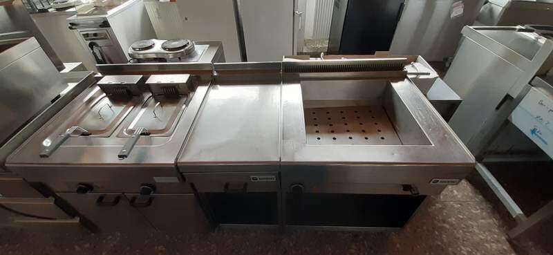 Die Kochstrecke besteht aus folgenden Einzelteilen, elektrische Bain-Marie, gebraucht, gut erhalten, funktionstüchtig und offenen Arbeitsschrank mit Schubfach
