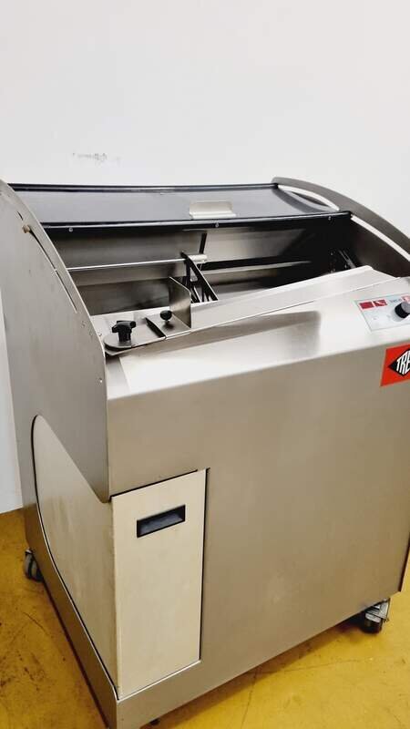 Die Treif Diskus Brotschneidemaschine ist fahrbar mit Feststeller und das Messer ist neu geschliffen und beschichtet sie ist mit manueller einfacher Bedienung über Drehregler für den perfekten Schnitt.