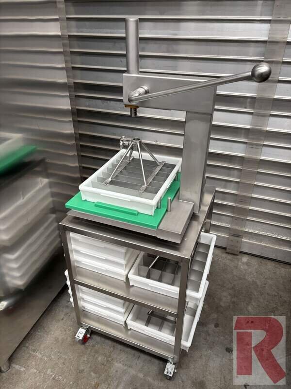 Teigteiler (handbetrieben) inkl. fahrbarem Untergestell aus Edelstahl, 10 Kunststoffwannen, ca. 41,5 x 31,5 cm, für jeweils ca. 13 Liter, d. h. ca. 4,5 bis 7,5 kg Teig sowie 3 Messersternen für Baguette, Ciabatta und Quadrate