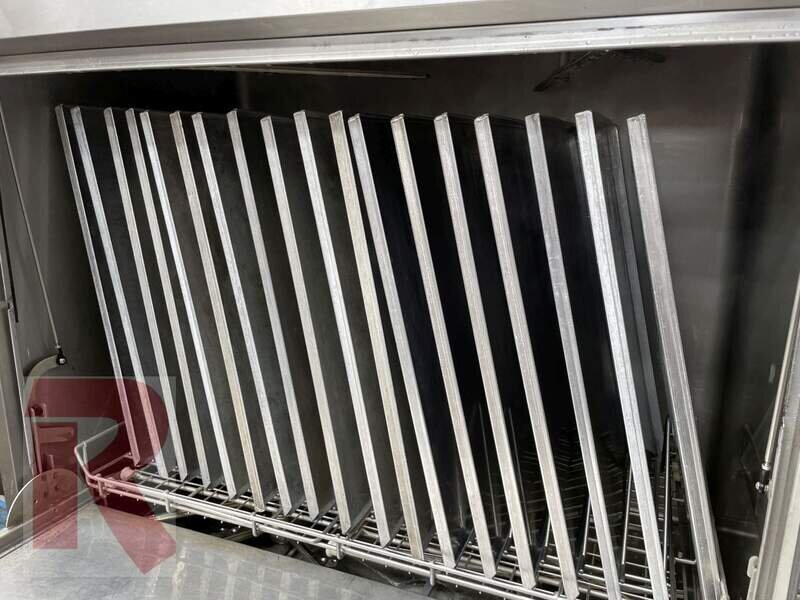Universal dish- / utensilwasher Hobart UXT-10A for boxes, baskets, trays, bowls, tools and much more ... Year of manufacture 2017, initial commissioning in 11/2021 (!) only 1,500 operating hours, 380 or 400 V, approx. 21.6 kW, (32 A CEE plug) can be reduced to approx. 15.7 kW if required. - Incl. rinsing basket and 2 holders for trays (see photos). (4 rinse programs: approx. 120, 240 and 360 seconds and endless program), incl. detergent and rinse aid dosing. Used, cleaned, tested, fully functional, maintained condition, see photos. The control (circuit board) was renewed once a few years ago. The current new price is more than 22.000,- EUR net, plus VAT. Machine without Vapostop (exhaust air heat recovery).