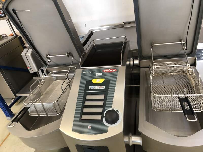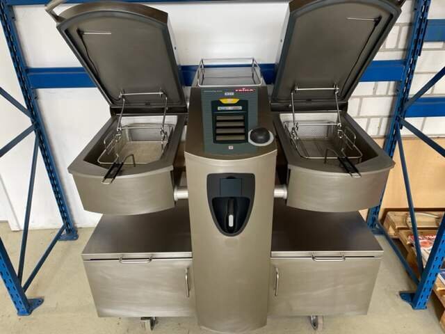 Das Gerät ist zum Kochen, Braten und Frittieren, läuft auf 400 Volt, 17 kW, Wasserzulauf und -ablauf, zwei unabhänig einstellbare Tiegel mit je 14 Liter, Kerntemperaturfühler, Touchscreen Display, Temperaturbereich 30 - 250 °C, integrierte Steckdose und Handbrause, mit Unterschränken rechts und links, Werkstatt geprüft, sofort einsatzbereit, Maße b/T/H 125/78/112 cm, weiteres auf Anfrage.