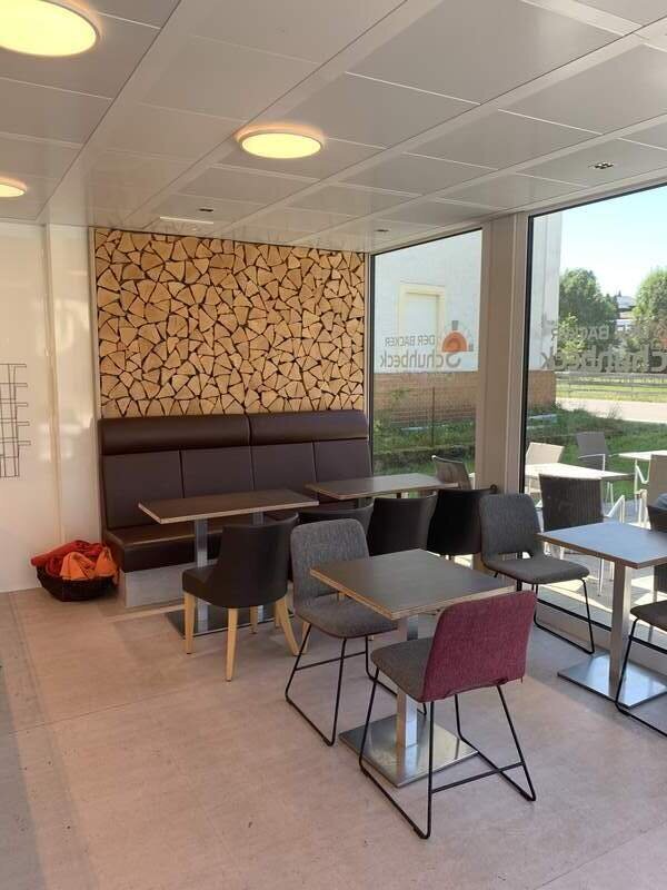 Brotregal mit Rückanlage und kleinem Sitzkaffee.