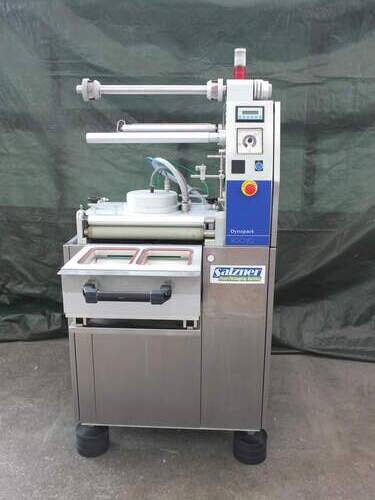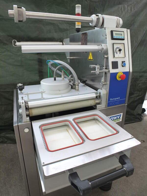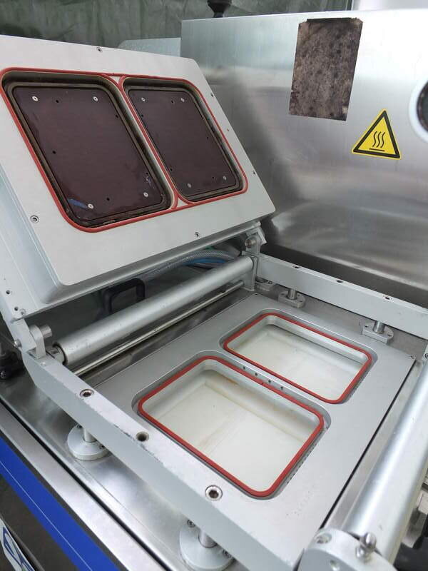 Halbautomatische Schalensiegel-Verpackungsmaschine der Firma Meca Typ 900 VG in gebrauchtem, sehr gut erhaltenem Zustand. Baujahr 2002. Auf Wunsch generalüberholt.