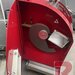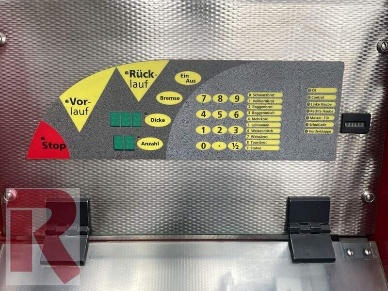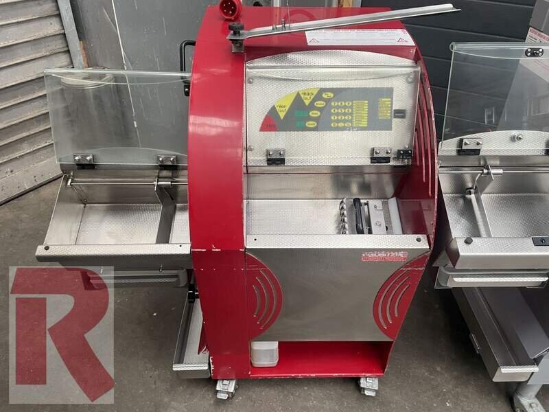 Sichelmesser-Brotschneidemaschine Wabäma Economy 380.220 als SB-Variante bzw. "Plus" Elektronik, Baujahr 2005 / 2006, voll funktionsfähig, in der SB-Variante mit automatisch verriegelnden Abdeckhauben zum Einlegen und Entnehmen des Brotes, Schnittstärke in 0,5 mm Schritten zwischen 4 und 25 mm (bzw. in der SB-Variante 8, 9 und 12 mm vorprogrammiert) wählbar. Auch Roggen- und Kornbrote werden dank automatischer Beölung des Messers Scheibe für Scheibe präzise und ohne zu verkleben geschnitten. (Eine optinale Beölung ist in der "Plus" Variante vorhanden, d. h. die rote Maschine auf den Bildern.) Die Maschine ist für Brote bis ca. 22 cm Breite, 38 cm Länge und 16,5 cm Höhe geeignet. Die Front ist teilweise in Edelstahl verkleidet, die Maschine wird geprüft und gereinigt angeboten, voll funktionsfähig. Das Messer ist neu geschliffen und beschichtet.