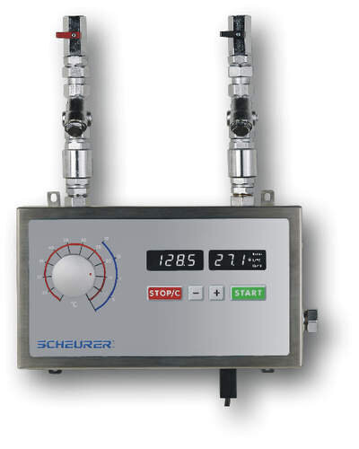 Mikroprozessor-elektronisches Wassermisch- und -dosiergerät mit digitaler Tastatur zur Einstellung der Wassermenge, mit Display zur Anzeige der Wassermenge und Temperatur, Edelstahlgehäuse, Baujahr 2025