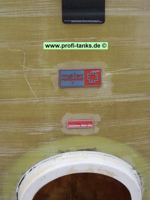 Oberirdischer, stehender Tank auf Sockel. Dom vorne auf der Stirnseite, mehrere Zu- und Ausläufe. Hersteller Rotband, eine sehr gute Qualität.