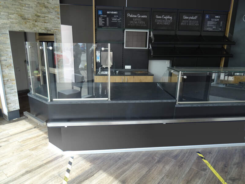 Trockentheke 2,43 m, Ausgabe 0,82 m, verglaste hohe Präsentation 1,10 m