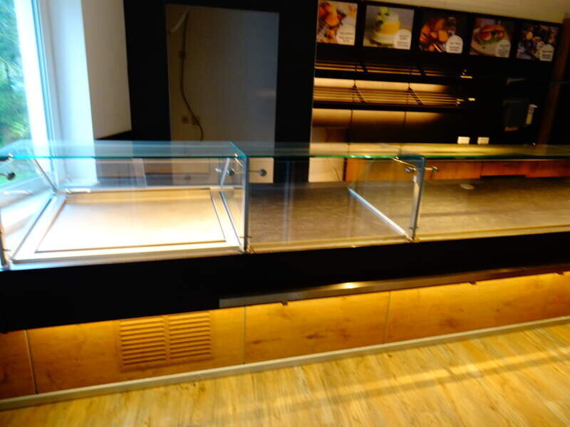 sehr gut erhaltene Bäckereitheke von Lingus Ladenbau, Gesamtlänge 5,90 m, davon sind 1,25 m und 0,85 m gekühlt.